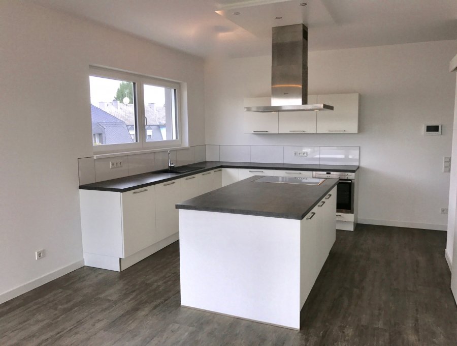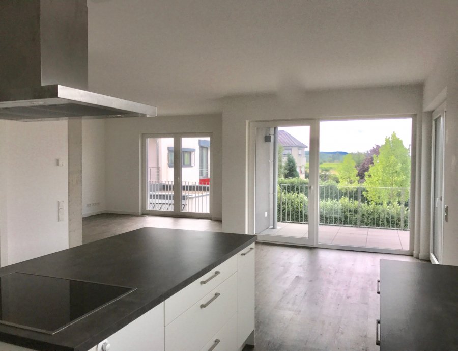 Hall d' entrée, Living très lumineux (+-40m2) avec accès Terrasse (+-14m2 / Exposition Ouest / Vue sur Casino Schlossberg , cuisine équipée ouverte avec accès Terrasse, 2 Débarras,