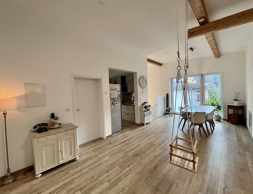Hall d'entrée, Living (+-40m2) donnant sur cuisine équipée ouverte (Valeur 20.000 Euros / 2020), 1 chambre (+-14m2), salle de douche italienne, Jardin privé (+-40m2 / Exposition Est).