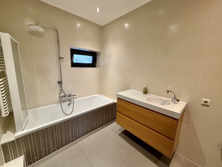 Hall d'entrée (+-6m2), Living (+-40m2) équipée d'un feu ouvert avec accès Terrasse (+-20m2 / Exposition Ouest / couverte) et Jardin privé clôturé (+-168m2), cuisine équipée ouverte (2004 / Valeur 20.000 Euros), salle de bains (2020 / +-6m2), 1 chambre (+-12m2).