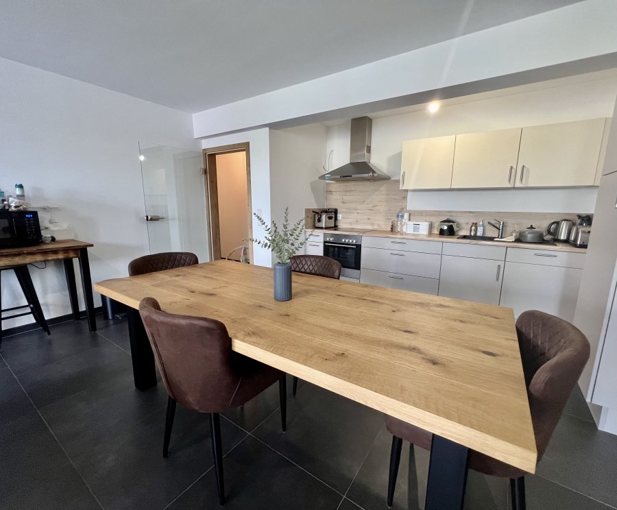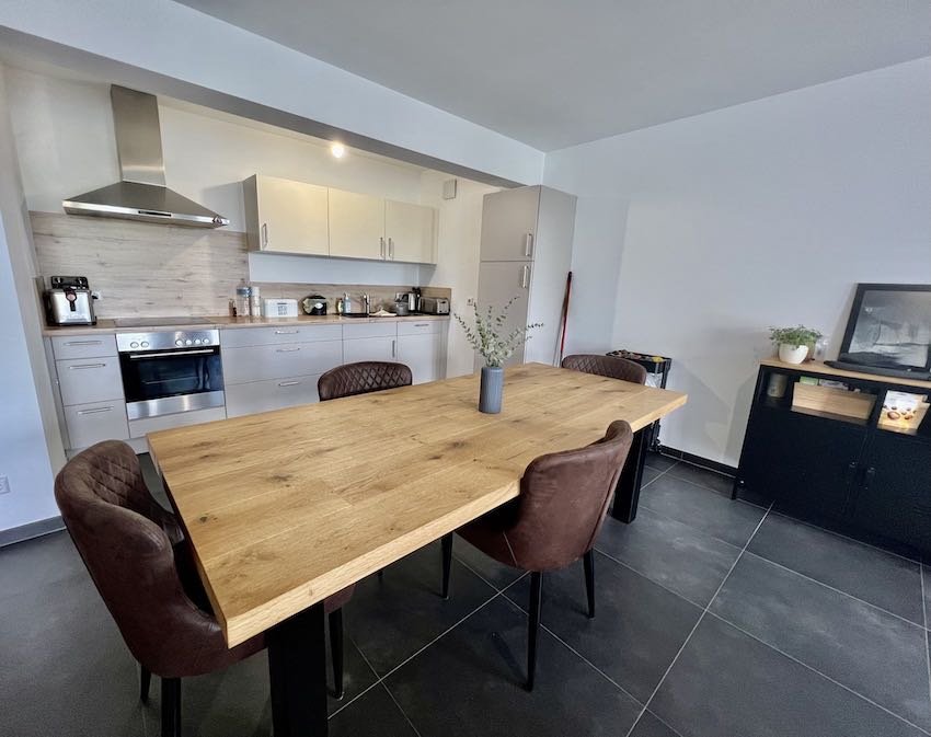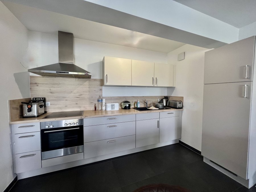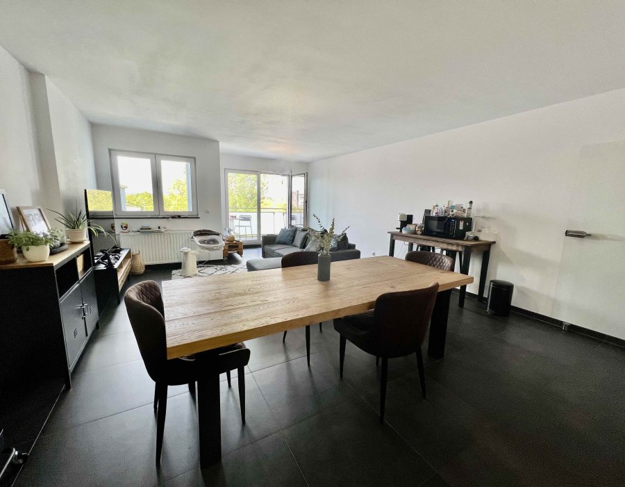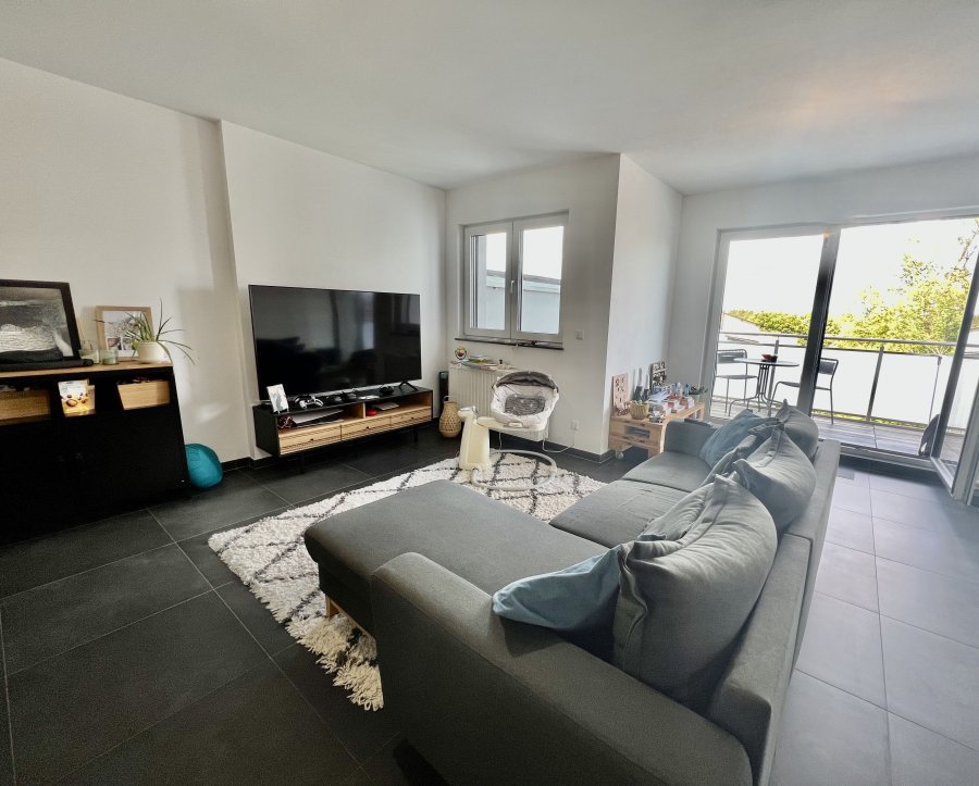 Hall d'entrée (+-8m2), WC séparé, Living très lumineux (+-35m2) avec accès Terrasse (+-5m2), cuisine équipée ouverte (2015 / Valeur 15.000 Euros), salle de douche italienne (2015), 2 chambres (+-14m2, 12m2).