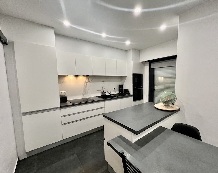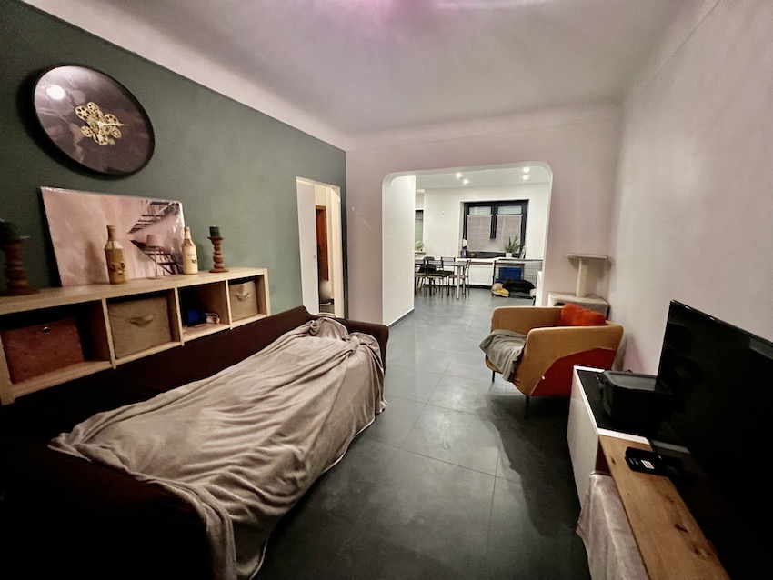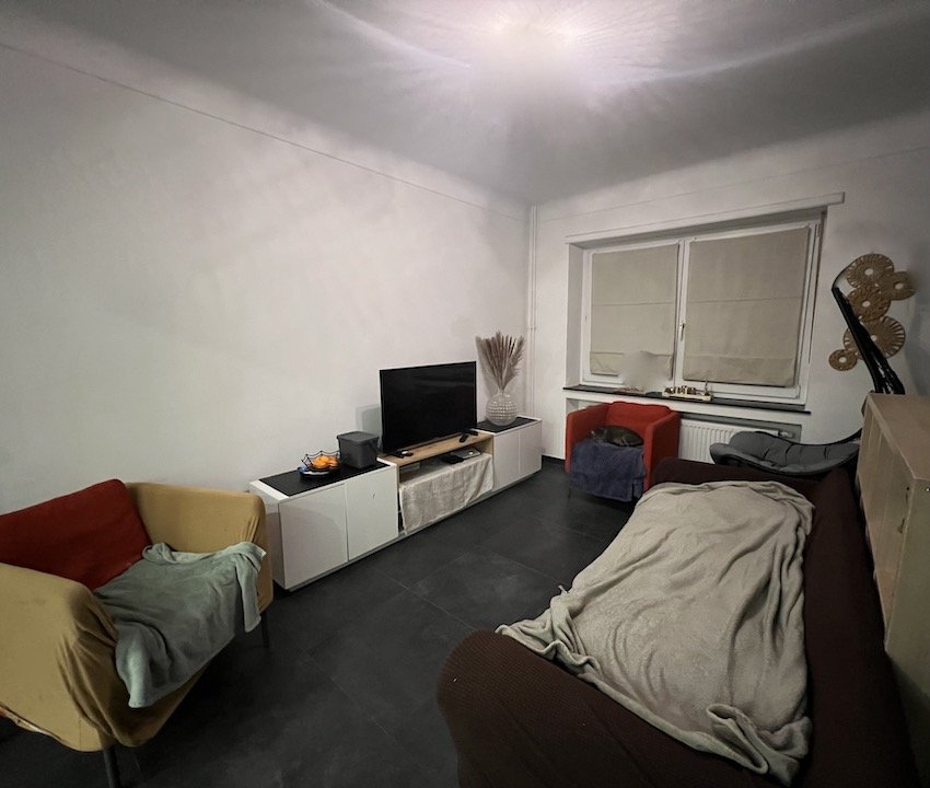 Hall d'entrée (+-5m2), Living spacieux (+-30m2), cuisine équipée ouverte donnant sur Living (2018 / Valeur 20.000 Euros) avec accès Terrasse (+-20m2 / Exposition Nord-Est) et Jardin clôturé, WC séparé (+-1m2)