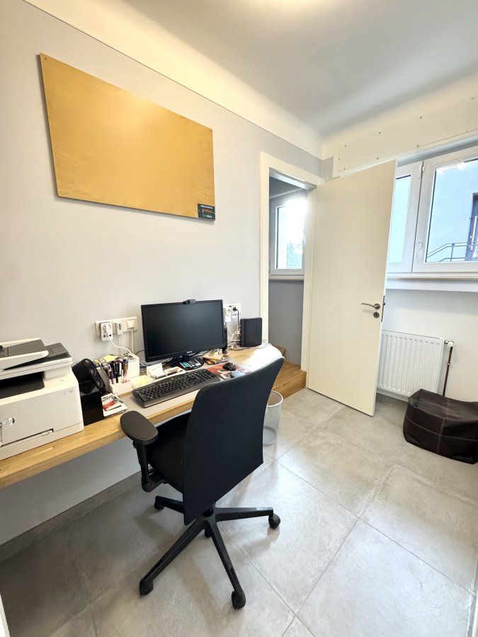 Hall d'entrée (+-13m2) avec placards encastrés, cuisine équipée (+-12m2), living-salle à manger (+-34,50m2) avec accès terrasse et jardin, salle de bains (+-10,80m2) avec douche italienne et baignoire, WC séparé, 1 chambre à coucher (+-11m2), coin bureau (+-5m) et accès à l'étage.