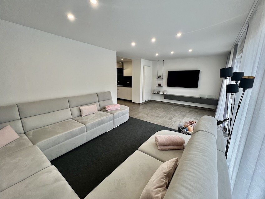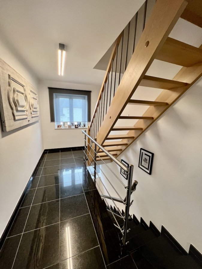 Hall d'entrée (+-5m2) avec armoires encastrés, Living (+-50m2) donnant sur cuisine équipée ouverte avec salle à manger (2020 / Valeur 40.000 Euros) avec armoires encastrés et Salon donnant sur Terrasse (+-80m2 / Exposition Nord-Ouest) et Jardin clôturé (+-3 ares), WC séparé (+-2m2),