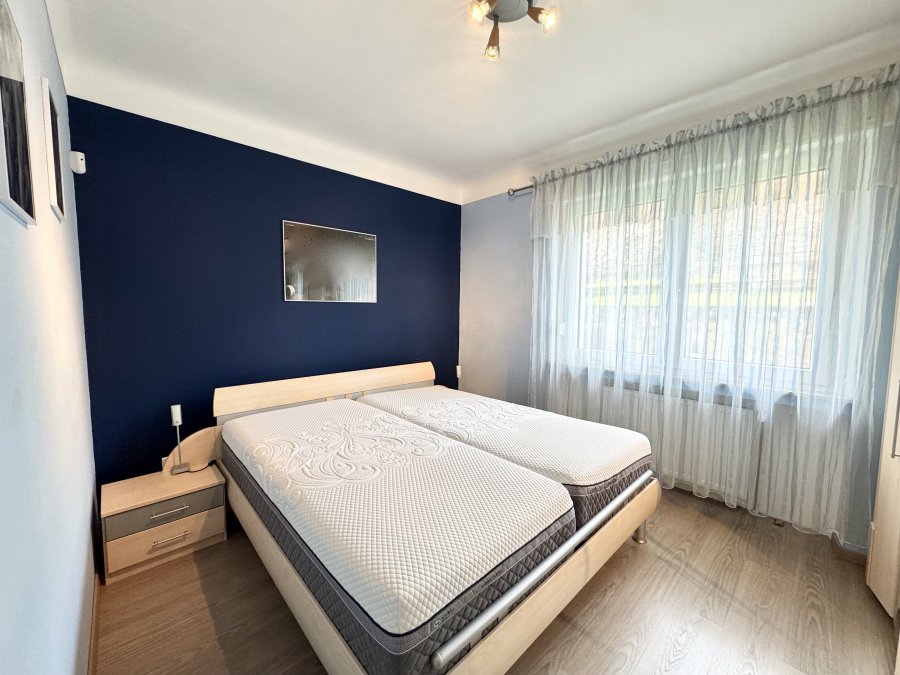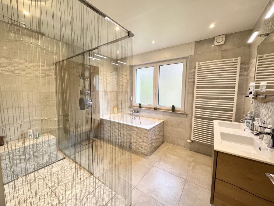 Hall d'entrée (+-13m2) avec placards encastrés, cuisine équipée (+-12m2), living-salle à manger (+-34,50m2) avec accès terrasse et jardin, salle de bains (+-10,80m2) avec douche italienne et baignoire, WC séparé, 1 chambre à coucher (+-11m2), coin bureau (+-5m) et accès à l'étage.