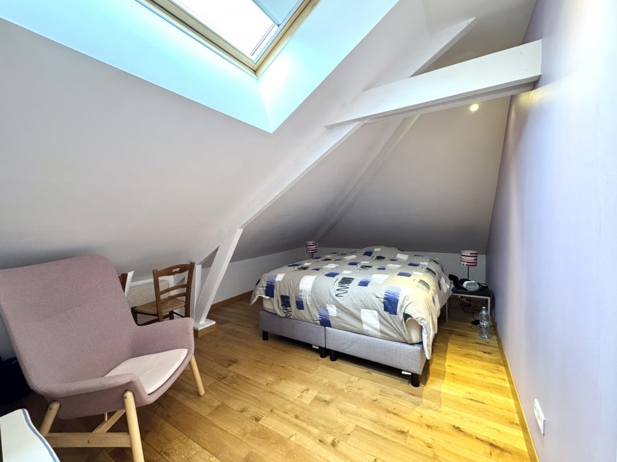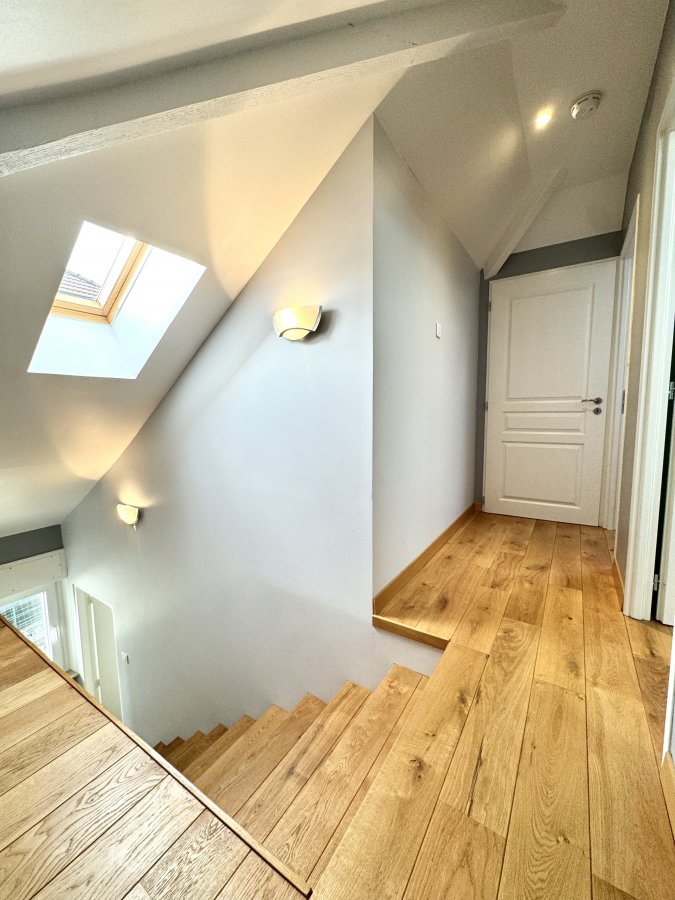 hall de nuit, 2 chambres à coucher dans les combles avec chacune une surface au sol de +-19,50m2, débarras.
